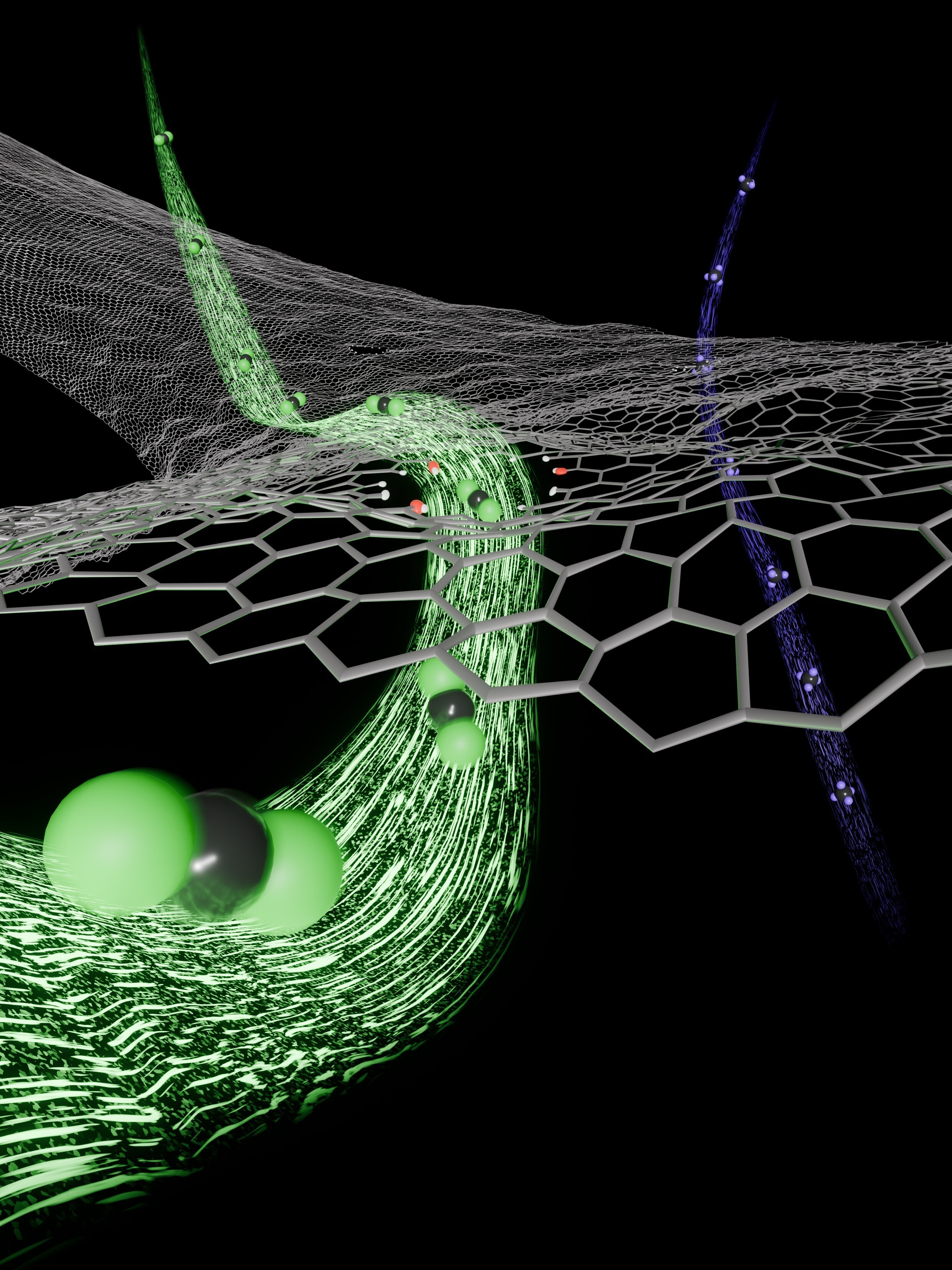 One promising method for efficiently separating CO2 from these gases is filtration using graphene membranes containing nanosized pores. Graphene is particularly attractive as a filtration material because of its exceptional mechanical strength and chemical and thermal stability. While pristine graphene is naturally impermeable to gases, introducing pores allows it to selectively separate gas molecules.